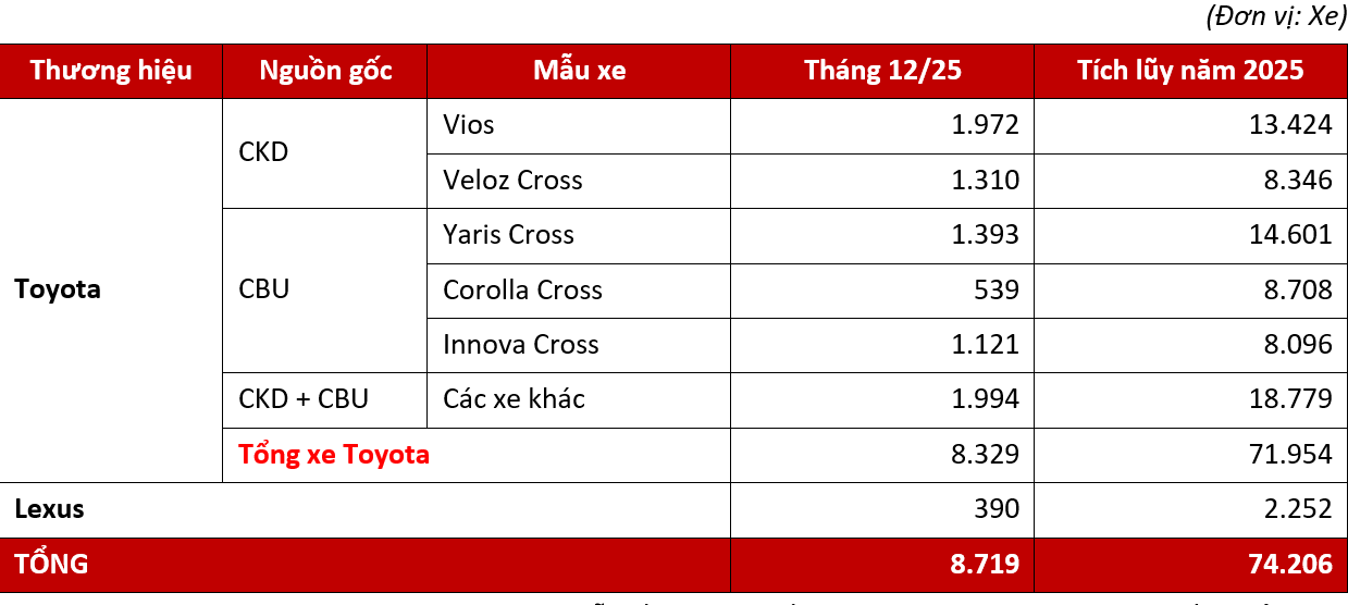 Cụ thể, doanh số toàn quốc của các mẫu xe Toyota đạt 8.329 xe, bao gồm 3.597 xe lắp ráp trong nước và 4.732 xe nhập khẩu nguyên chiếc, nâng tổng doanh số tích lũy năm 2025 lên 71.954 xe và tăng 8% so với năm 2024.