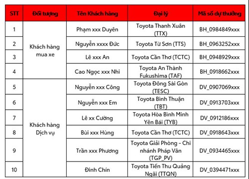 Công ty Ô tô Toyota Việt Nam xin chúc mừng 10 khách hàng đã may mắn trúng thưởng trong chương trình “Quay số trúng thưởng coupon Dịch vụ” cho khách hàng làm khảo sát qua tin nhắn của Toyota Việt Nam.
