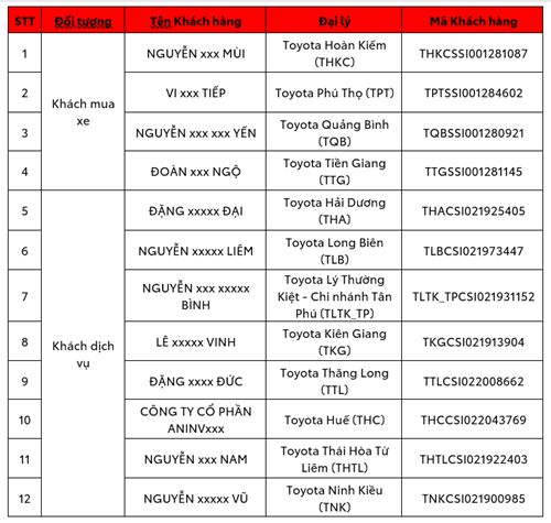 Công ty Ô tô Toyota Việt Nam xin chúc mừng 12 khách hàng sẽ nhận quà tặng Coupon Dịch vụ trị giá 2 triệu đồng trong Chương trình: “Tri ân Khách hàng tích cực thực hiện khảo sát Đánh giá chất lượng Bán hàng, Dịch vụ tại các Đại lý của Công ty Ô tô Toyota Việt Nam” tháng 9 năm 2025, thỏa mãn điều kiện sau: