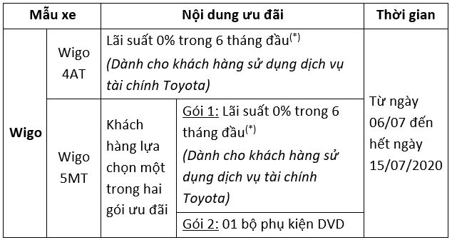 Hà Nội, ngày 06/07/2020, Công ty Ô tô Toyota Việt Nam thực hiện chương trình ưu đãi dành cho khách hàng hoàn tất thủ tục thanh toán 100% khi mua xe Toyota Wigo. Thông qua chương trình, chúng tôi muốn mang đến nhiều hơn nữa lợi ích cho khách hàng nhằm hướng tới sự hài lòng cao nhất.