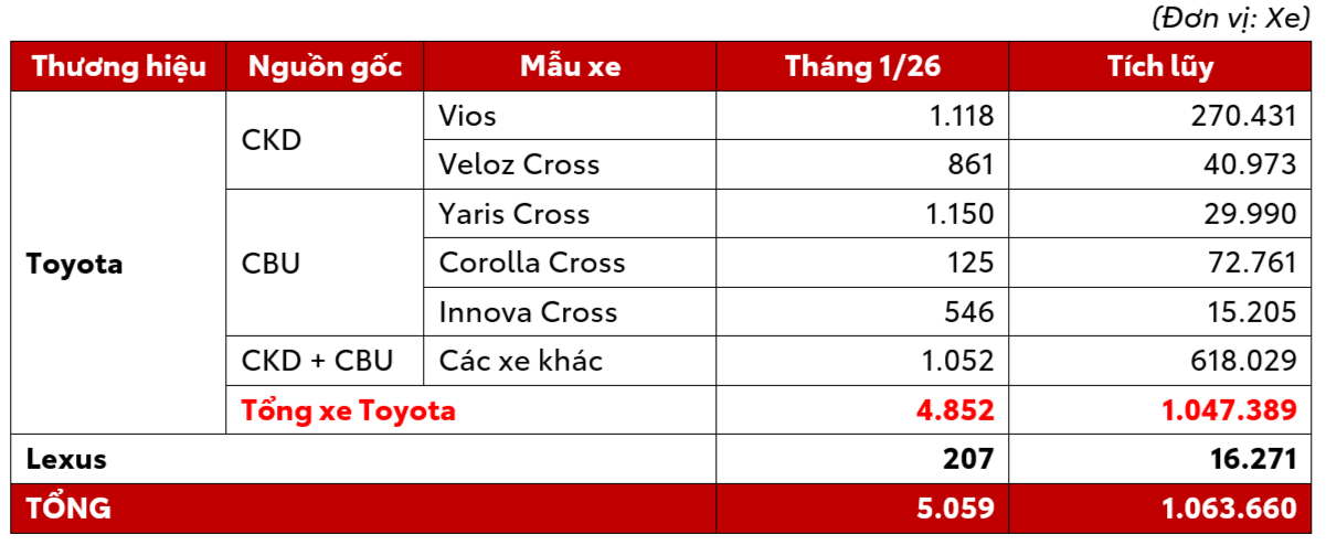 Công ty Ô tô Toyota Việt Nam (TMV) công bố doanh số bán hàng trong tháng 1/2026 đạt 5.059 xe (bao gồm xe Lexus).