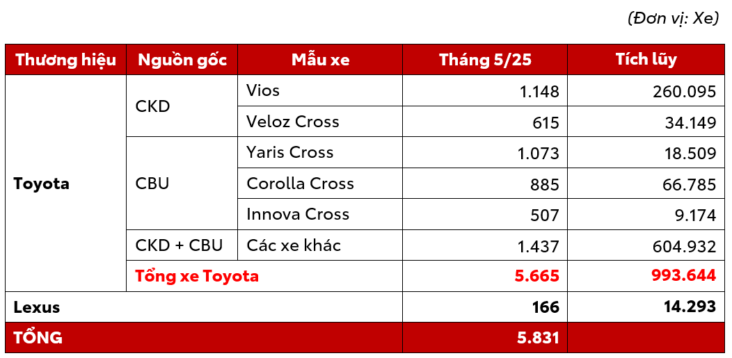 Công ty Ô tô Toyota Việt Nam công bố doanh số bán hàng trong tháng 5/2025 đạt 5.831 xe (bao gồm xe Lexus).