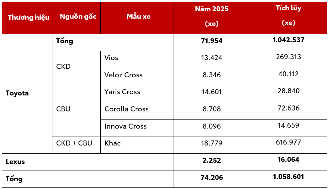 - Về bán hàng, doanh số của Toyota Việt Nam đạt 74.206 xe trong năm 2025 (bao gồm Lexus), tăng 8% so với năm 2024.