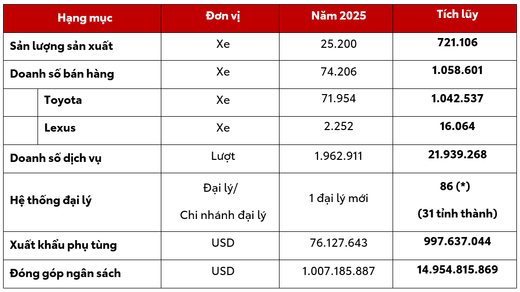 - Về đóng góp ngân sách nhà nước, Toyota Việt Nam đã đóng góp hơn 1 tỷ USD trong năm 2025, tăng 14% so với năm 2024 và là một trong những doanh nghiệp đóng thuế hàng đầu cả nước trong nhiều năm liên tiếp. Tổng số tiền đóng góp ngân sách nhà nước tích lũy đạt gần 15 tỷ USD.