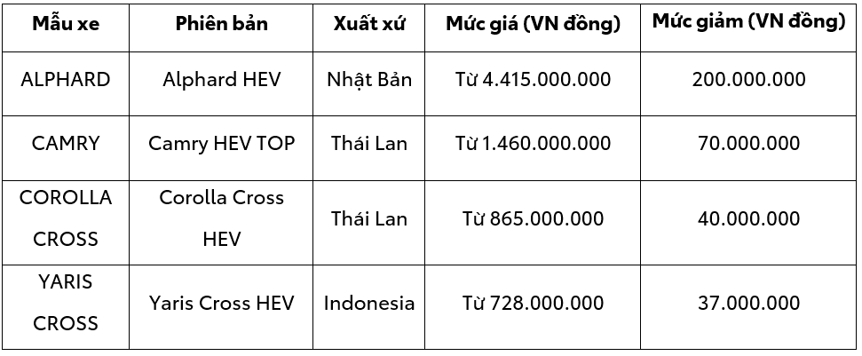Thông qua việc kết hợp mức giá mới cạnh tranh, chính sách bảo hành dài hạn, chi phí sử dụng hợp lý cùng các chương trình hỗ trợ đổi xe, Toyota Việt Nam muốn tạo điều kiện để khách hàng dễ dàng và tiếp cận công nghệ Hybrid một cách thuận lợi hơn cũng như tự tin hơn khi lựa chọn sử dụng xác dòng xe Toyota Hybrid, đồng thời góp phần thúc đẩy xu hướng di chuyển bền vững tại Việt Nam.