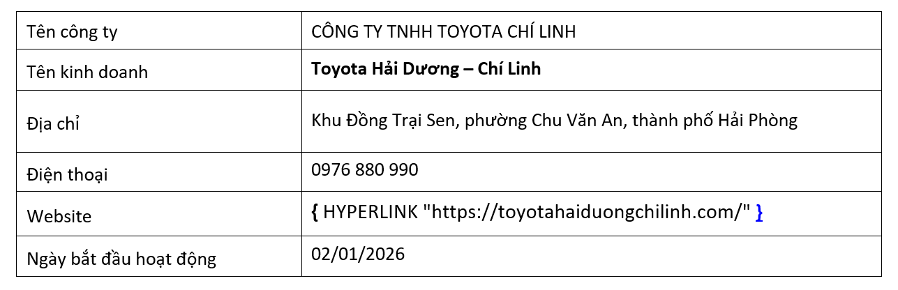 Theo đó, Toyota Hải Dương – Chí Linh có địa chỉ tại Khu Đồng Trại Sen, Phường Chu Văn An, Thành phố Hải Phòng, sẽ chính thức đi vào hoạt động từ ngày 2/1/2026, đưa tổng số Đại lý/Chi nhánh đại lý và Trạm uỷ quyền của Toyota lên con số 87.